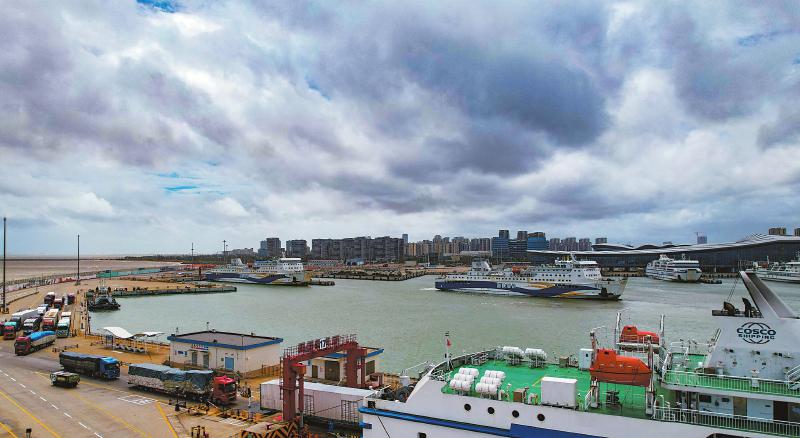 受“蝴蝶”影响,琼州海峡客滚船于6月12日11时起全线停运。图为海口市新海港,货车在停航前驶入客滚船准备过海(无人机照片)。 新华社记者 杨冠宇 摄