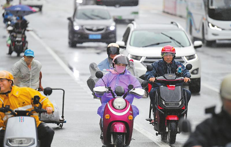 海南省气象局12日09时10分继续发布台风三级预警。受今年第1号台风“蝴蝶”影响,三亚、琼海、万宁、乐东、保亭、琼中等市县幼儿园从6月12日开始停课。图为6月12日,在三亚市吉阳区,市民冒雨骑行。新华社记者 赵颖全 摄