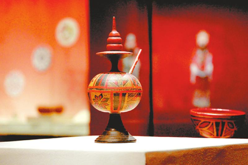 民国木胎漆绘高脚酒壶(凉山彝族自治州博物院藏)。