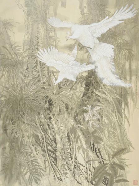 孔雀难画,四川画家安华平却是一个勇者,知难而上,通过色彩和笔触的交融,画出了白孔雀的富丽典雅、雍容华贵。他大胆地直接用白粉开画,反复用白色来勾勒线条,重合堆积,让画面呈现出类似油画的厚度和亮度。在安华平的作品中,可以看到画家的审美追求与孔雀自然形象融为一体,画面呈现恰如其分,不露人工雕琢之感,让观众感到一种纯粹和静美。安华平的白孔雀工笔画,整体有一种朦胧而温馨的诗意,其韵味让人过目难忘。白孔雀在雾感中既生动灵性又清新脱俗,舒展优雅、逸态毕现、姿韵生辉,表现出自然与生灵的和谐共存。 (余如波)
