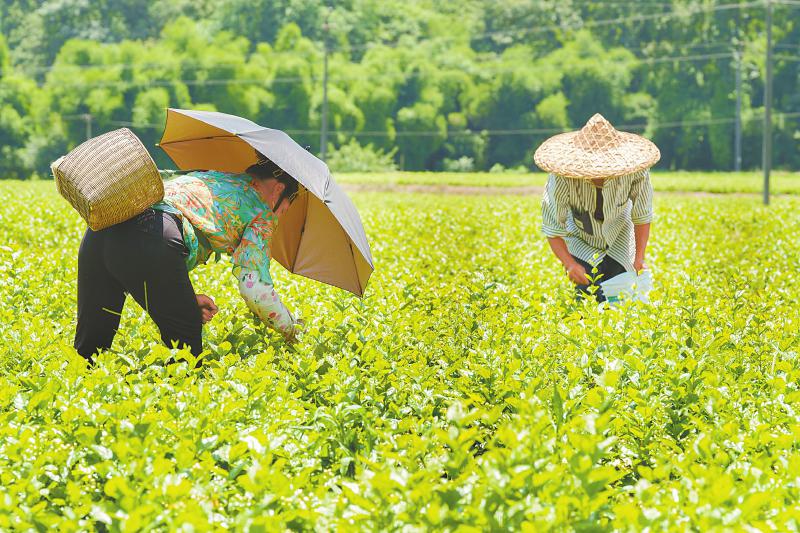 •   6月15日中午12点,在眉山市青神县,当地村民顶着烈日采摘茉莉花花骨朵。用于泡茶的茉莉花在花骨朵时采摘,香气会更加浓郁,而花骨朵在中午或下午最为饱满,因此,茉莉花采摘的时间尽量选在这个时间段。 张家坤 摄(C视觉)