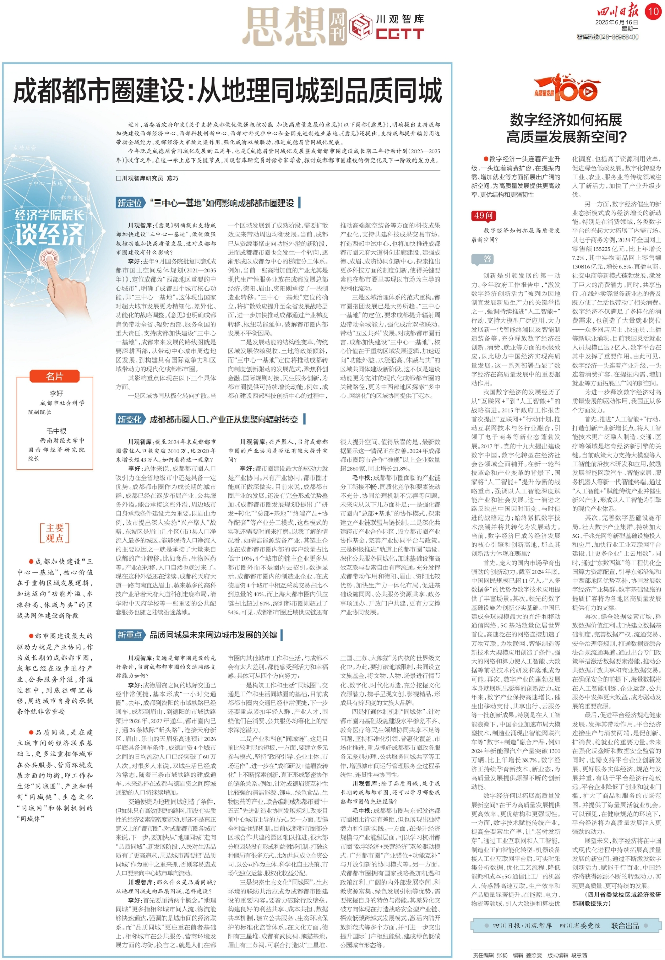 三是区域治理体系的范式重构。都市圈抱团发展已是大势所趋,“三中心一基地”的定位,要求成都提升辐射周边带动全域能力,强化成渝双核联动,带动“五区共兴”发展。对成都都市圈而言,成都加快建设“三中心一基地”,核心价值在于重构区域发展逻辑,加速迈向“功能外溢、水涨船高、休戚与共”的区域共同体建设新阶段。这不仅是建设动能更为充沛的现代化成都都市圈的关键路径,更为中西部地区探索“多中心、网络化”的区域协同提供了范本。