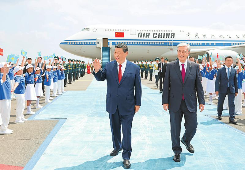习近平抵达阿斯塔纳纳扎尔巴耶夫国际机场时,托卡耶夫总统率总统办公厅主任达杰拜、副总理兼外长努尔特列乌、总统外事顾问卡济汉、阿斯塔纳市长卡瑟姆别克等高级官员热情迎接。身着盛装的哈萨克斯坦女青年向习近平献花。礼兵分列蓝地毯两侧致敬,哈萨克斯坦少年儿童手持中哈两国国旗热烈欢迎习近平到访。习近平在托卡耶夫陪同下观看仪仗队分列式,直升机悬挂中哈国旗从机场上空飞过。在机场贵宾楼内,两国元首还共同欣赏哈萨克斯坦少年儿童的文艺表演。