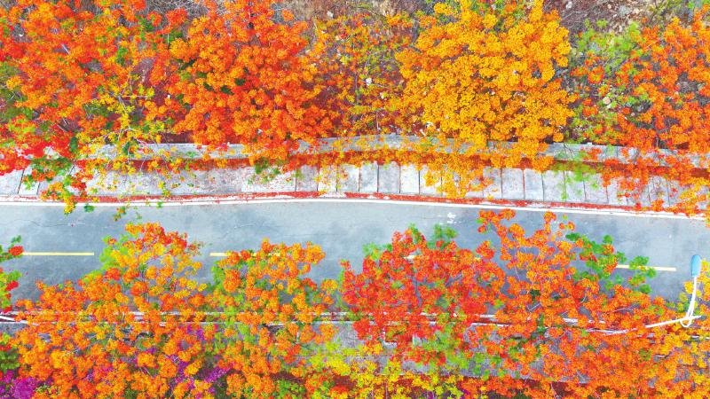 打卡“山水灵秀新城”,看山是必选项。每逢初夏,步入西佛山景区,总能被“蓝红”双色的极致浪漫惊艳。这里既有大规模集中种植的蓝花楹,也有连片成海的凤凰木,盛花期“双姝”同框绽放,一个如梦似幻,一个明艳如火,吸引游客纷至沓来。
