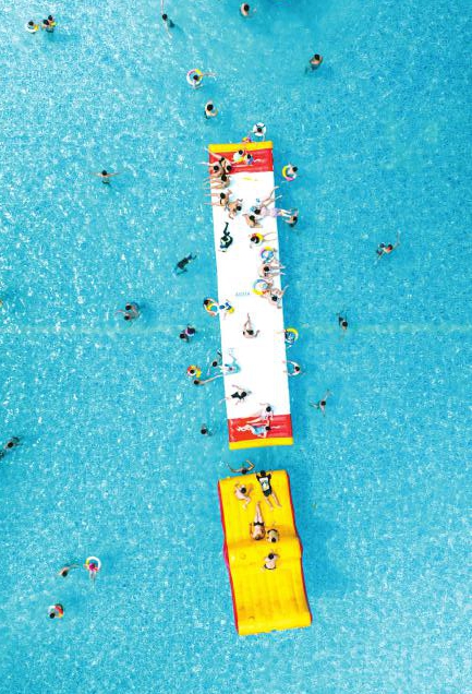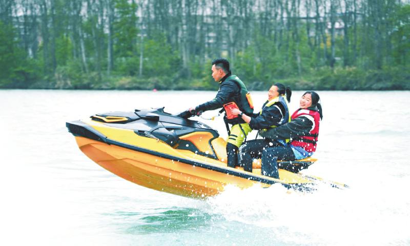 沱江之畔,游人脚踩“水上飞人”装置腾空而起,水雾在空中划出银色弧线。不远处,摩托艇破浪前行,在水面划出一道道波纹……岸边的游客不禁拍手叫好,不少人更是跃跃欲试。