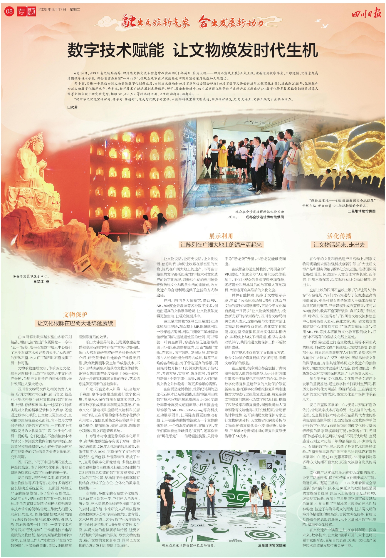 种种有益探索,拓宽了文物展示手段、丰富了公众体验场景、增强了观众与文物的接触和情感纽带,正是今年文化和自然遗产日要求“让文物焕发新活力,绽放新光彩”的深刻践行。四川省文物局相关负责人表示,虚拟拓展与实体固本是让文物活起来的有益尝试。强化数字化赋能,就应坚持虚拟拓展与实体固本相结合,实现线上与线下相贯通、虚拟与实体双轨并行,共同推进文物保护工作不断取得新成就。