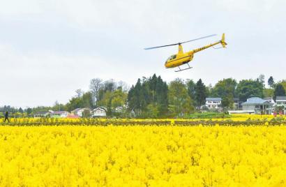 广安市广安区花桥镇,游客乘坐直升机观赏油菜花。广安建川博物馆聚落。游客在广安区大龙镇建设村体验黄桃采摘。