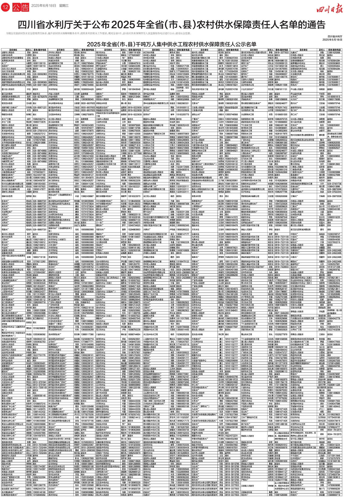 四川省水利厅关于公布2025年全省(市、县)农村供水保障责任人名单的通告