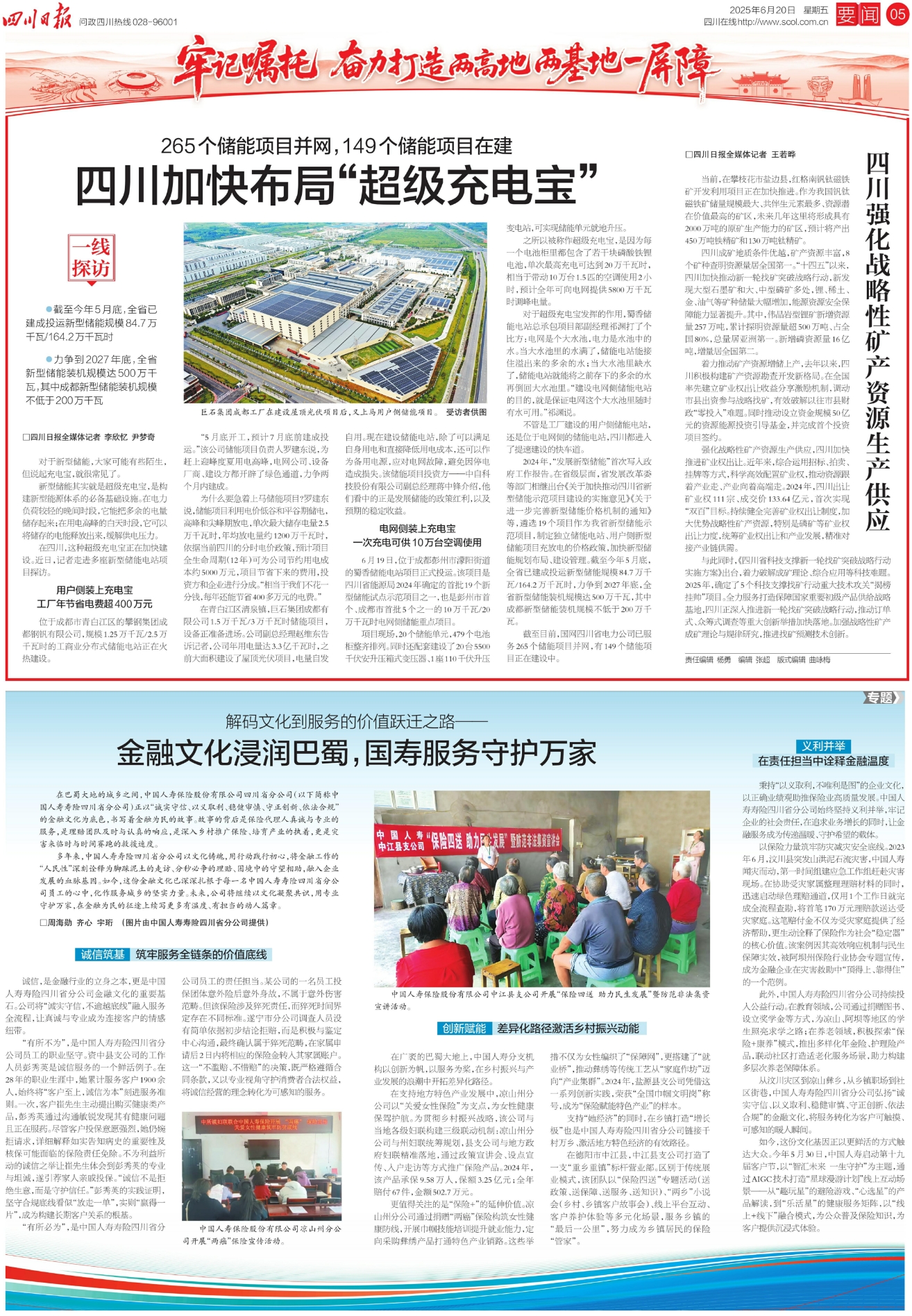 四川成矿地质条件优越,矿产资源丰富,8个矿种查明资源量居全国第一。“十四五”以来,四川加快推动新一轮找矿突破战略行动,新发现大型石墨矿和大、中型磷矿多处,锂、稀土、金、油气等矿种储量大幅增加,能源资源安全保障能力显著提升。其中,伟晶岩型锂矿新增资源量257万吨,累计探明资源量超500万吨、占全国80%,总量居亚洲第一。新增磷资源量16亿吨,增量居全国第二。