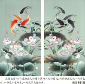 她的代表作品之一,双面同形异色绣《荷花鲤鱼》,一面为红色鲤鱼,另一面为黑灰色鲤鱼,采用蜀绣的滚针、沙针、晕针、切针等针法技巧,鲤鱼的每一个鳞片都是单独绣制,呈现出色彩明快、鲜活灵动的质感。更特别的是,作品呈现出独特的光亮质感,让充满生命力的鲤鱼们,仿佛随着光影的变化游动起来。虚实之间,亦真亦幻。2012年,孟德芝凭借这幅作品,成功申报为中国工艺美术大师。