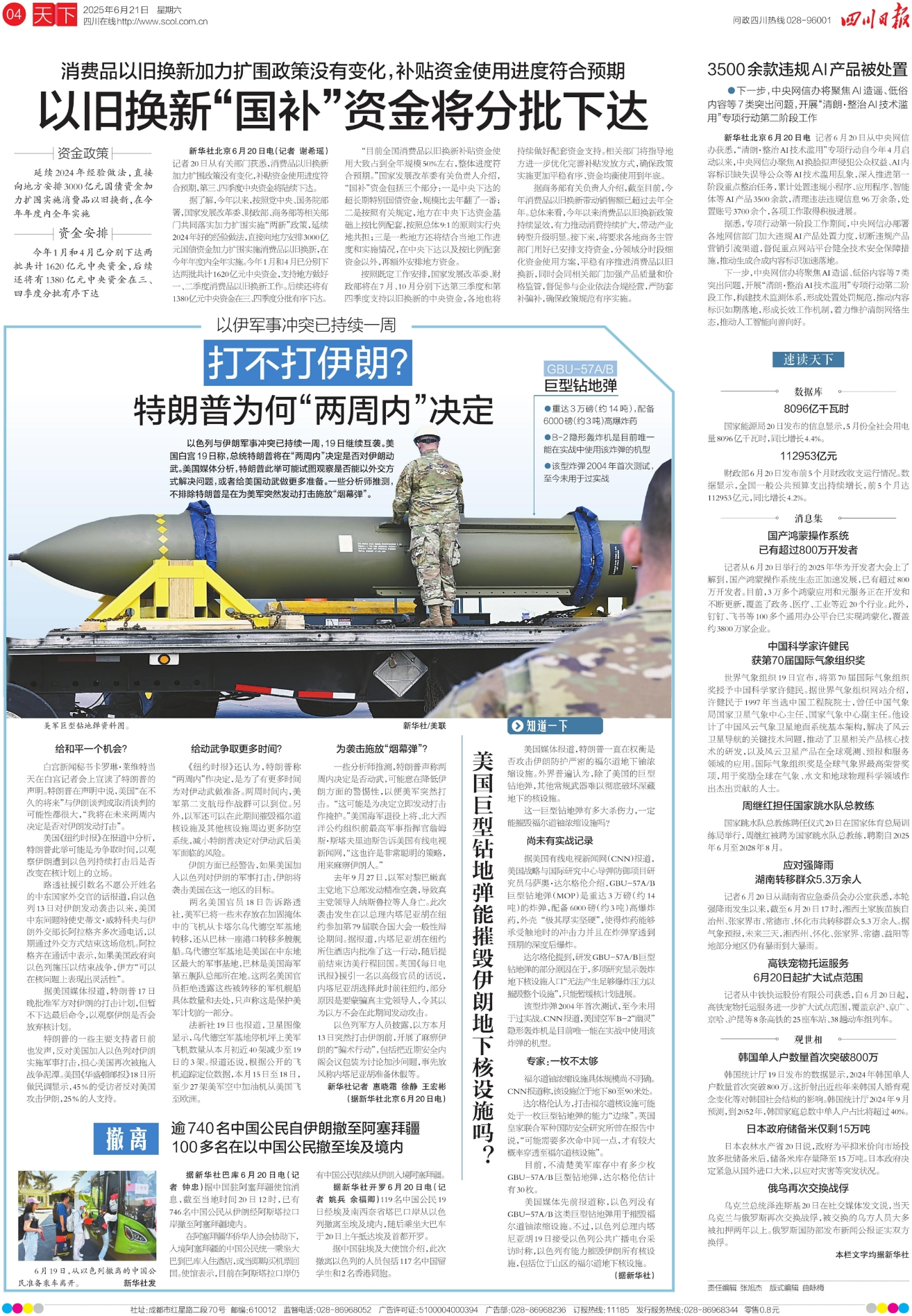 美国媒体先前报道称,以色列没有GBU-57A/B这类巨型钻地弹用于摧毁福尔道铀浓缩设施。不过,以色列总理内塔尼亚胡19日接受以色列公共广播电台采访时称,以色列有能力摧毁伊朗所有核设施,包括位于山区的福尔道地下核设施。(据新华社)