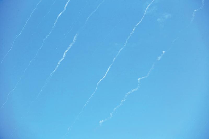 6月22日,在耶路撒冷,防空系统发射拦截弹留下烟轨。 新华社记者 陈君清 摄