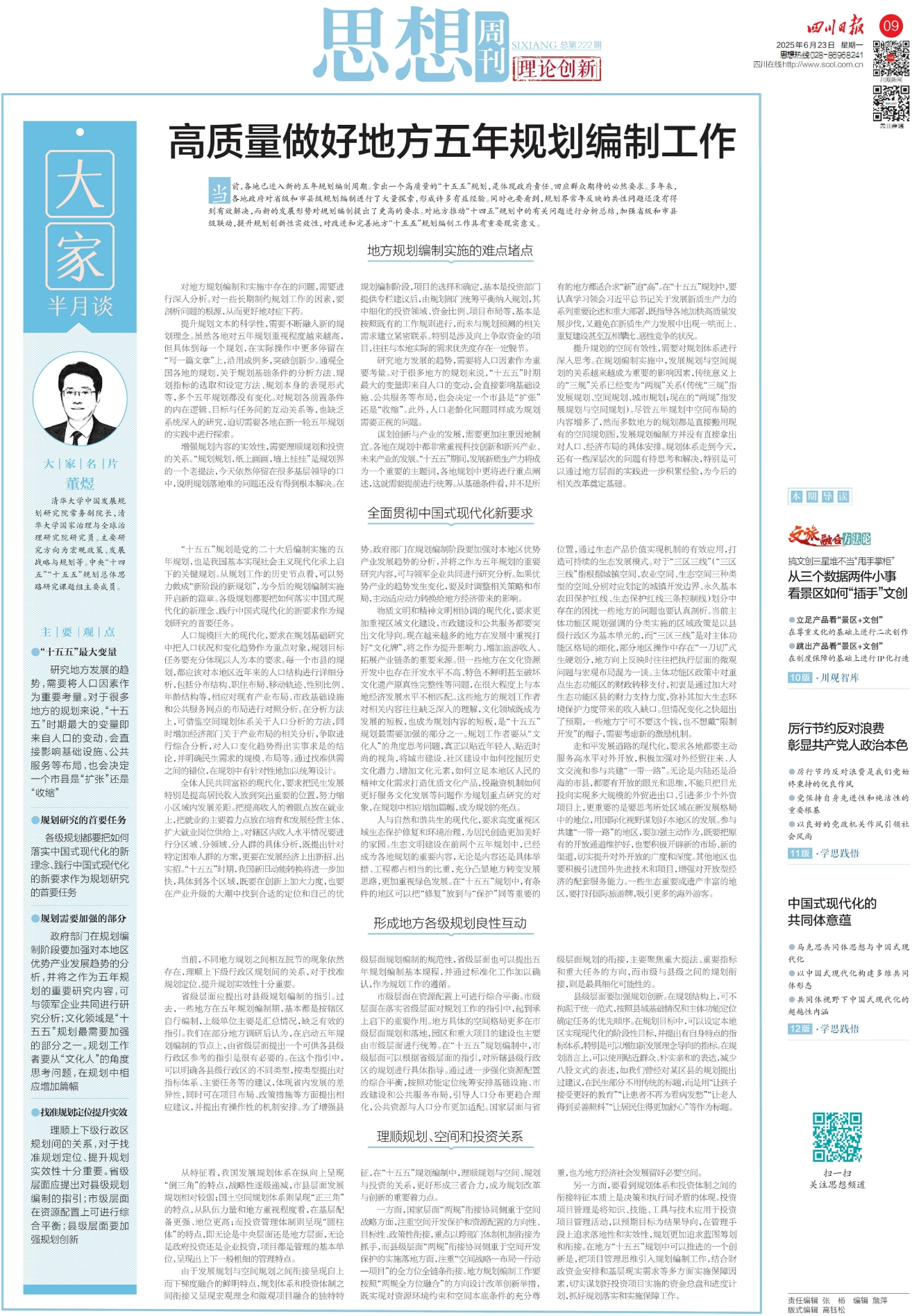 物质文明和精神文明相协调的现代化,要求更加重视区域文化建设,市政建设和公共服务都要突出文化导向。现在越来越多的地方在发展中重视打好“文化牌”,将之作为提升影响力、增加旅游收入、拓展产业链条的重要来源。但一些地方在文化资源开发中也存在开发水平不高、特色不鲜明甚至破坏文化遗产原真性完整性等问题,在很大程度上与本地经济发展水平不相匹配。这些地方的规划工作者对相关内容往往缺乏深入的理解,文化领域既成为发展的短板,也成为规划内容的短板,是“十五五”规划最需要加强的部分之一。规划工作者要从“文化人”的角度思考问题,真正以贴近年轻人、贴近时尚的视角,将城市建设、社区建设中如何挖掘历史文化潜力、增加文化元素,如何立足本地区人民的精神文化需求打造优质文化产品,投融资机制如何更好服务文化发展等问题作为规划重点研究的对象,在规划中相应增加篇幅,成为规划的亮点。