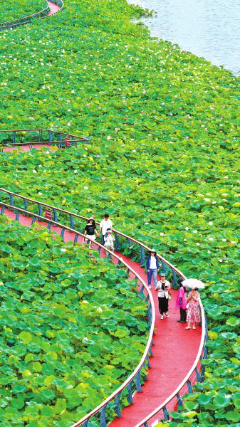 近期,遂宁观音湖圣莲岛上荷花绽放,进入最佳观赏期,吸引不少游客前来打卡。作为涪江上的一座江心河滩岛,圣莲岛曾经面临生态功能日趋降低等问题。遂宁相继启动堤防建设、荷花博览园建设、海绵化改造、湿地提升等改造项目,让圣莲岛重现水清岸绿、鸢飞鱼跃。2024年,圣莲岛所在的涪江(船山段)成功入选第二批四川省美丽河湖优秀案例名单。 目前,岛上建设的世界荷花博览园已获评国家4A级旅游景区,园内荷花沿观音湖布局,种植面积600余亩,来自23个国家和地区,有近800种20万余株。 遂宁观察 刘作鹏 摄