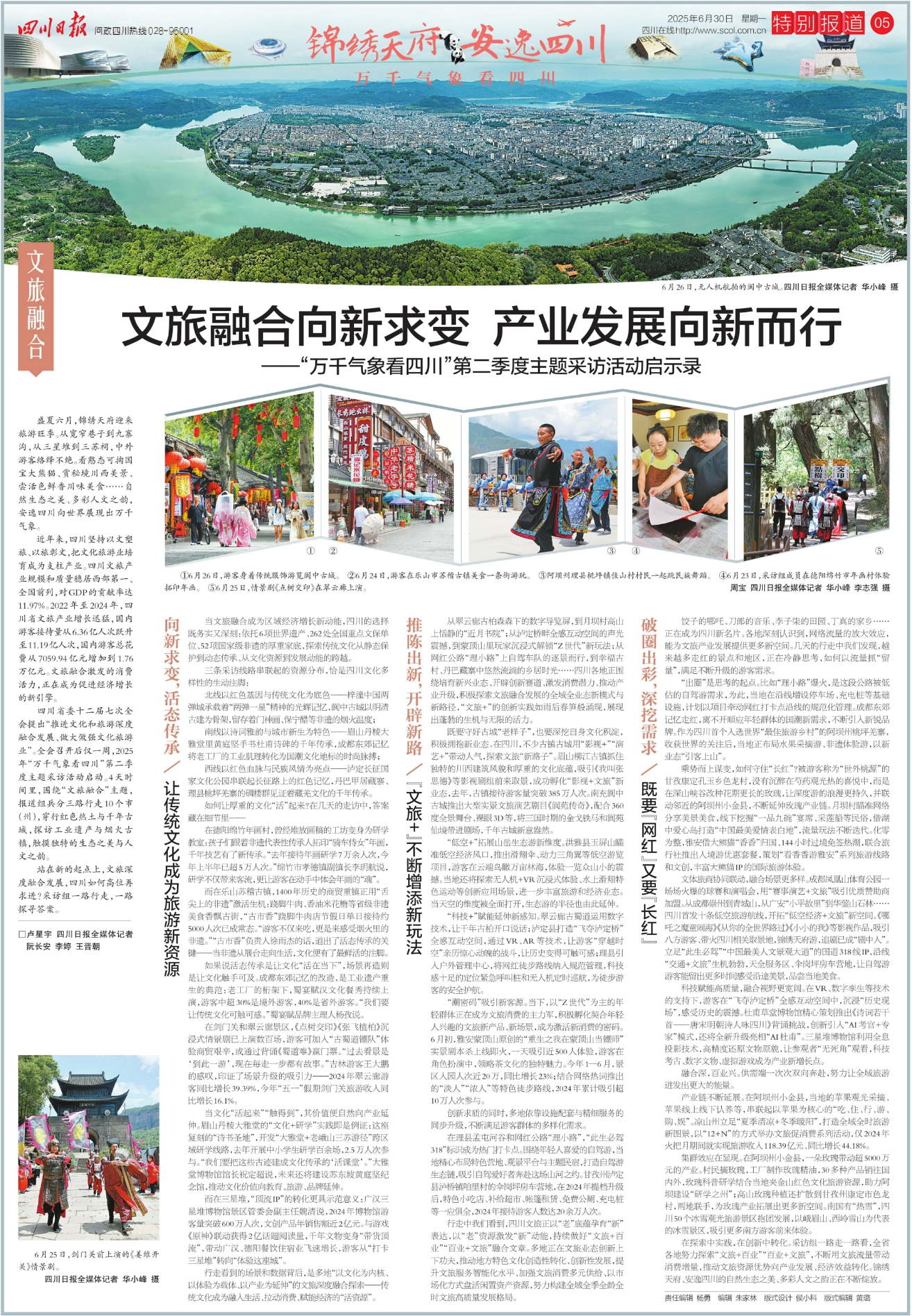 行走中我们看到,四川文旅正以“老”底蕴孕育“新”表达,以“老”资源激发“新”动能,持续做好“文旅+百业”“百业+文旅”融合文章。多地正在文旅业态创新上下功夫,推动地方特色文化创造性转化、创新性发展,提升文旅服务智能化水平、加强文旅消费多元供给、以市场化方式盘活闲置资产资源,努力构建全域全季全龄全时文旅高质量发展格局。