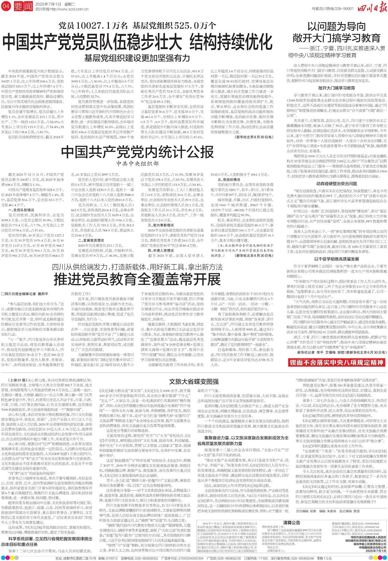 党员队伍结构持续优化。截至2024年底,大专及以上学历党员5778.6万名,占57.6%,比上年提高1.4个百分点;女党员3099.5万名,占30.9%,比上年提高0.5个百分点;少数民族党员773.4万名,占7.7%,与上年持平;工人和农民仍是党员队伍主体,占总数的32.7%。
