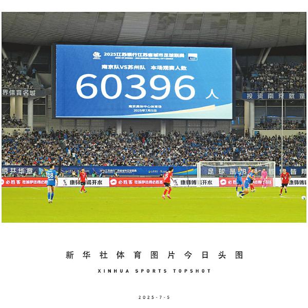 7月5日,球场大屏显示本场比赛共有60396名观众到场观赛,打破江苏省城市足球联赛单场上座纪录。当日,在江苏南京举行的2025江苏省城市足球联赛第六轮比赛中,南京队主场0比0战平苏州队。本栏文图均据新华社
