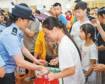 7月4日,孩子们到达广东省东莞市大朗镇,大朗公安民警随即开展“落地第一课”,提醒孩子们的暑期安全注意事项,并发放了暑期大礼包。四川日报全媒体记者 何海洋 摄影报道