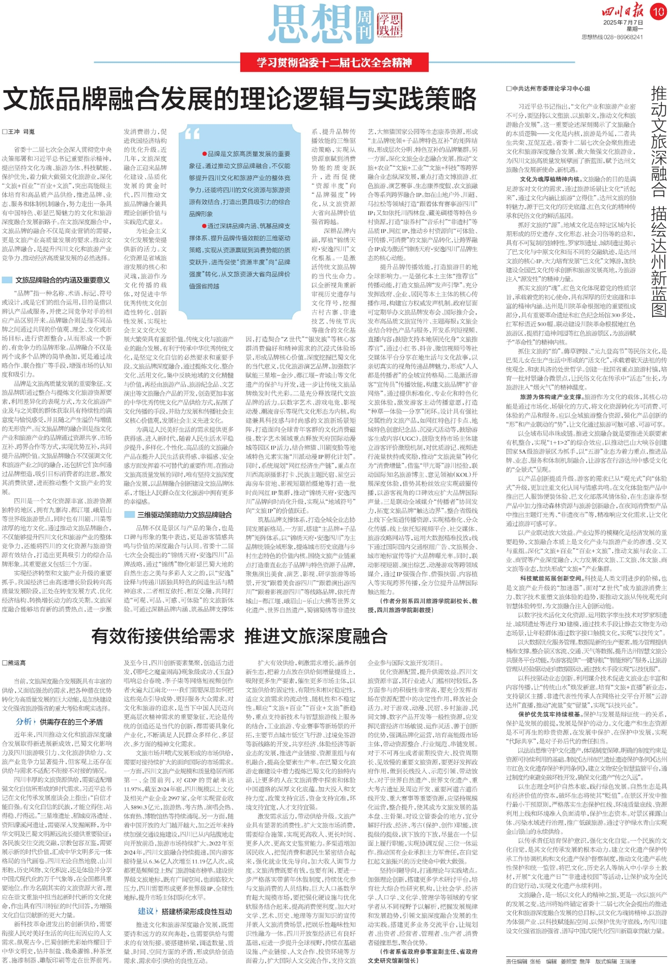 省委十二届七次全会深入贯彻党中央决策部署和习近平总书记重要指示精神,提出坚持文化为魂、旅游为体、科技赋能、保护优先,着力做大做强文化旅游业,深化“文旅+百业”“百业+文旅”,突出高能级主体培育和高品质产品供给,推进品牌、业态、服务和体制机制融合,努力走出一条具有中国特色、彰显巴蜀魅力的文化和旅游深度融合发展新路子。在文旅深度融合中,文旅品牌的融合不仅是商业营销的需要,更是文旅产业高质量发展的要求。推动文旅品牌融合,是提升四川文化和旅游产业竞争力、推动经济高质量发展的必然选择。