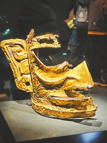 值得一提的是,在3000多年前的三星堆,同样也诞生出对黄金的崇拜,如三星堆的黄金面具、戴金面罩青铜人头像等文物,黄金的使用被赋予了人与神沟通的能力。纵使山海远隔,两地先民却把黄金面具当成了秩序与社会运行原则的具象化,昭示了不同区域间人们不谋而合的文化理念和智慧。