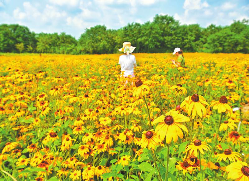 7月10日,成都周边盛开的向日葵花期已近尾声,在新都泥巴沱森林公园毗河一侧,大片盛开的向日葵花田成了今夏拍鸟爱好者的观鸟秘境。成群的金翅雀在花田间灵巧地飞跃,它们频繁地停在结满籽实的向日葵花盘上,用喙精准啄食葵花籽,自在地享用着这场大自然的盛宴。