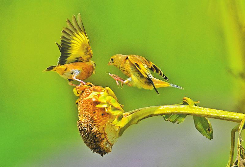 向日葵熟了 金翅雀花田争相“嗑瓜子”