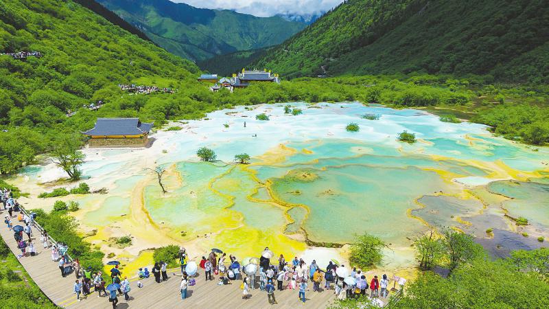 7月12日,游客在阿坝州松潘县黄龙景区游览。近日,“人间瑶池”黄龙景区内形状各异的彩池艳丽奇绝,在阳光的照耀下熠熠生辉,吸引全国各地游客前来观赏。 翁光建 摄(C视觉)