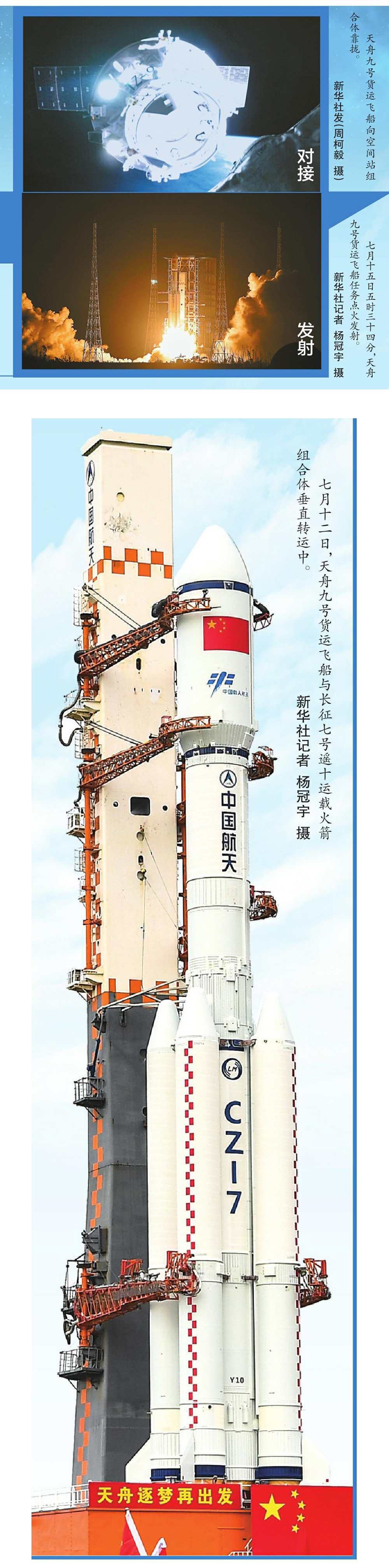 7月15日,文昌航天发射场。我国又一次向空间站派送“太空快递”。5时34分,在长征七号运载火箭的托举下,天舟九号货运飞船在晨曦中成功发射,将航天员在轨驻留消耗品、推进剂、应用实(试)验装置等物资送上太空。