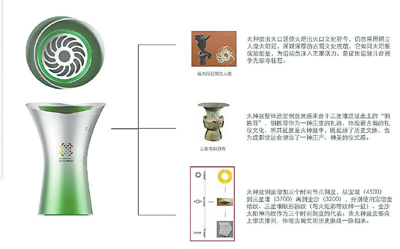火种盆整体造型创意灵感来自三星堆遗址出土的铜圆尊。“火种盆上有3个时间刻度,体现了成都平原古蜀文化时期3种文物的特点。”唐淼说,火种盆上的宝墩文化的稻穗纹,不仅是陶器纹饰,更是成都平原“天府粮仓”的起源;三星堆标志性的眼睛纹饰,凝视着金沙太阳神鸟在盆底绽放金光;4只神鸟环绕旋转的太阳,如运动员围绕圣火奔跑,将古蜀先民对光明的崇拜与当代体育精神完美融合。