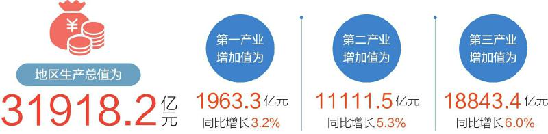 根据地区生产总值统一核算结果,上半年四川地区生产总值为31918.2亿元,按不变价格计算,同比增长5.6%。分产业看,第一产业增加值1963.3亿元,同比增长3.2%;第二产业增加值11111.5亿元,同比增长5.3%;第三产业增加值18843.4亿元,同比增长6.0%。