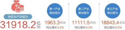 根据地区生产总值统一核算结果,上半年四川地区生产总值为31918.2亿元,按不变价格计算,同比增长5.6%。分产业看,第一产业增加值1963.3亿元,同比增长3.2%;第二产业增加值11111.5亿元,同比增长5.3%;第三产业增加值18843.4亿元,同比增长6.0%。