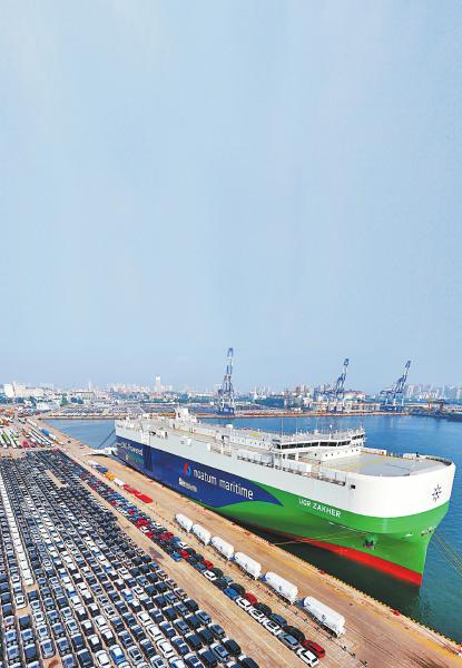 6月29日,汽车运输船在山东港口烟台港装运出口汽车(无人机照片)。新华社发(唐克 摄)