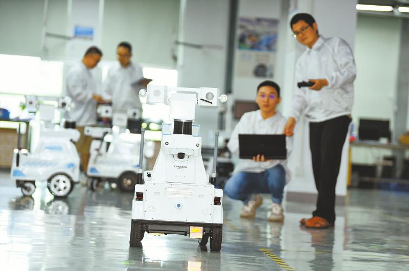 电子科大科技园(天府园)成都慧拓自动控制有限公司机器人制造产线,科研人员在检测巡检机器人性能。 四川日报全媒体记者 李向雨 摄