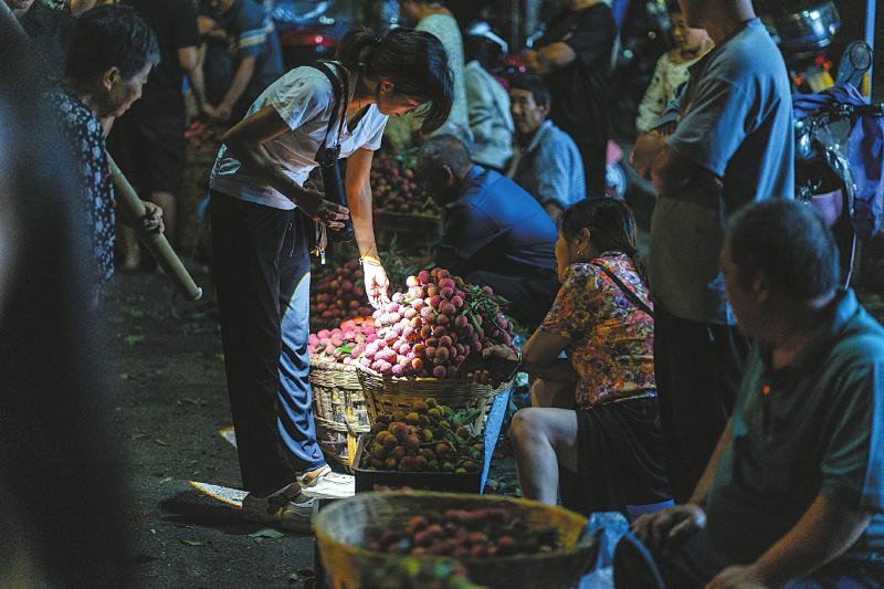 “12点上山,3点前必须下山,凌晨是黄金时段。”荔枝大户文俊杰边说边把刚剪下的“妃子笑”轻放筐中。夜凉露重,水汽锁住甜味,早一步上市就能多卖一块钱。不到3点,文俊杰家的小院灯火通明:分级、剪枝、套袋、装箱,动作一气呵成。一小时后,50多箱荔枝贴上“合江直发”标签,被快递小哥搬上面包车。依托当地现代化冷链,产地直发的新鲜荔枝在24小时内,便可直达北上广深等城市。与此同时,20公里外的合江县马街荔枝交易市场灯火通明。背篓、箩筐沿街排开,买家打着手电、捏果闻香,讨价还价声此起彼伏。每天,上万斤荔枝从这里流向全国。