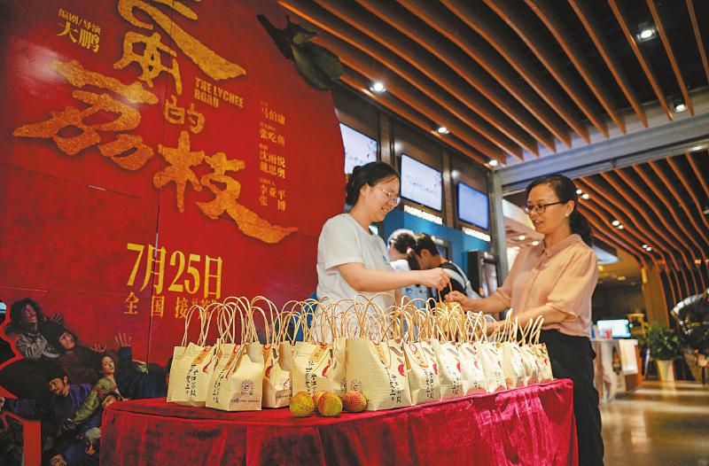 7月18日,合江鲜荔枝摆进成都太平洋影城王府井店,供《长安的荔枝》的观众品尝。