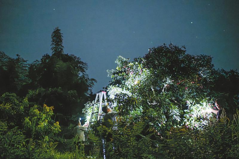 7月16日凌晨,荔枝大户文俊杰(中)和荔农一起戴着头灯、踩着梯子采摘成熟的荔枝。