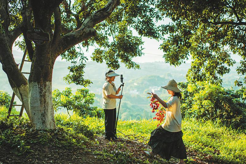 7月16日清晨,合江县荔江镇荔枝古树公园内,新农人姜晓霞(右)带着团队直播带货。