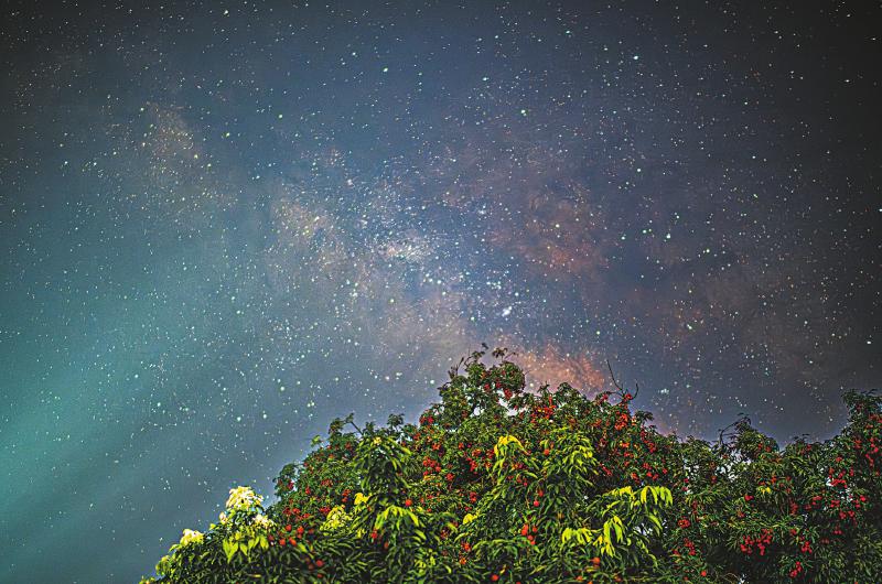 7月15日夜,百年荔树映银河,恰如范成大诗境:“甘露凝成一颗冰,露秾冰厚更芳馨。夜凉将到星河下,拟共嫦娥斗月明。”
