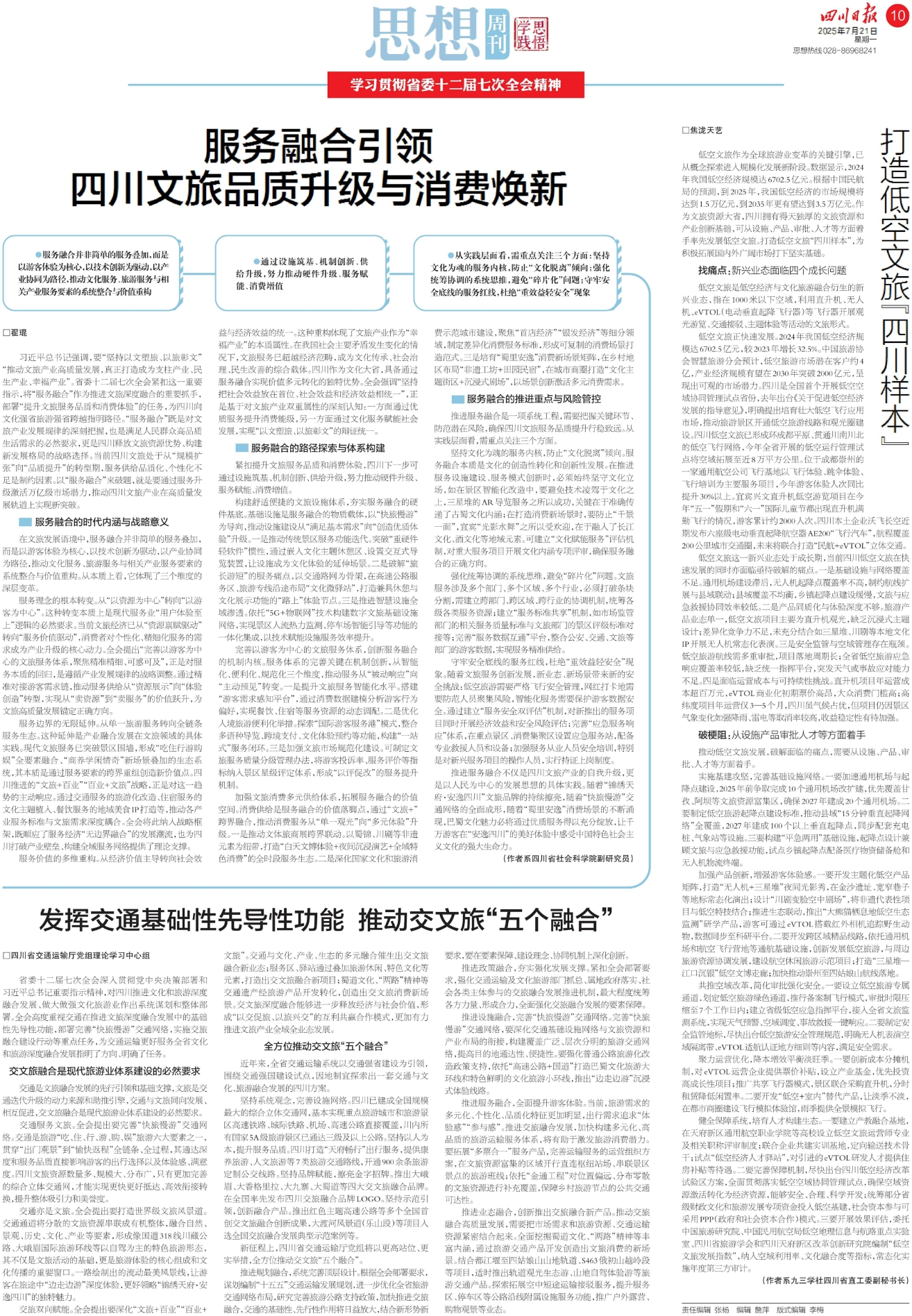 服务边界的无限延伸。从单一旅游服务转向全链条服务生态。这种延伸是产业融合发展在文旅领域的具体实践。现代文旅服务已突破景区围墙,形成“吃住行游购娱”全要素融合、“商养学闲情奇”新场景叠加的生态系统,其本质是通过服务要素的跨界重组创造新价值点。四川推进的“文旅+百业”“百业+文旅”战略,正是对这一趋势的主动响应。通过交通服务的旅游化改造、住宿服务的文化主题植入、餐饮服务的地域美食IP打造等,推动各产业服务标准与文旅需求深度耦合。全会将此纳入战略框架,既顺应了服务经济“无边界融合”的发展潮流,也为四川打破产业壁垒、构建全域服务网络提供了理论支撑。