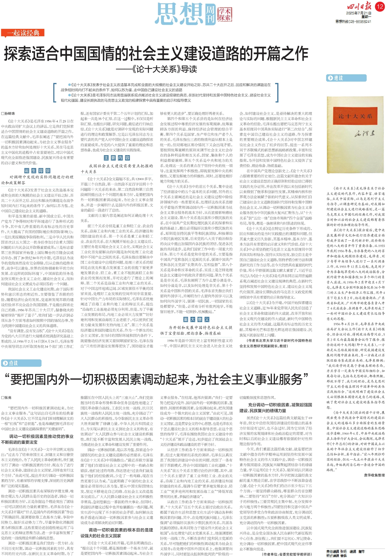 《论十大关系》是毛泽东关于社会主义建设的代表作,内容丰富、语言通俗,立足中国实际,以马克思列宁主义为指导,以调查研究为基础,对我国如何建设社会主义进行战略谋划,是一篇马克思主义中国化的经典之作,对我国当时和以后的社会主义建设都有着很强的针对性和理论指导作用。
