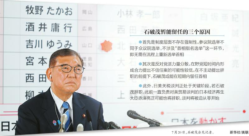 目前,石破茂暂能留任首相的原因有三:首先是制度层面不存在强制性。参议院选举不同于众议院选举,不涉及“首相指名选举”这一环节,即无需在流程上重新选举首相。