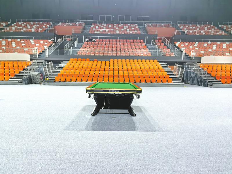 地板的改造也颇具特色。为了保护体育馆原始木地板不被划伤或压坏,场馆改造时采用了“地胶+地板+地毯”的形式,在原始木地板上先铺设一层厚厚的地胶,然后加铺一层专用的保护性地板,最后再覆盖一层比赛级的台球地毯。