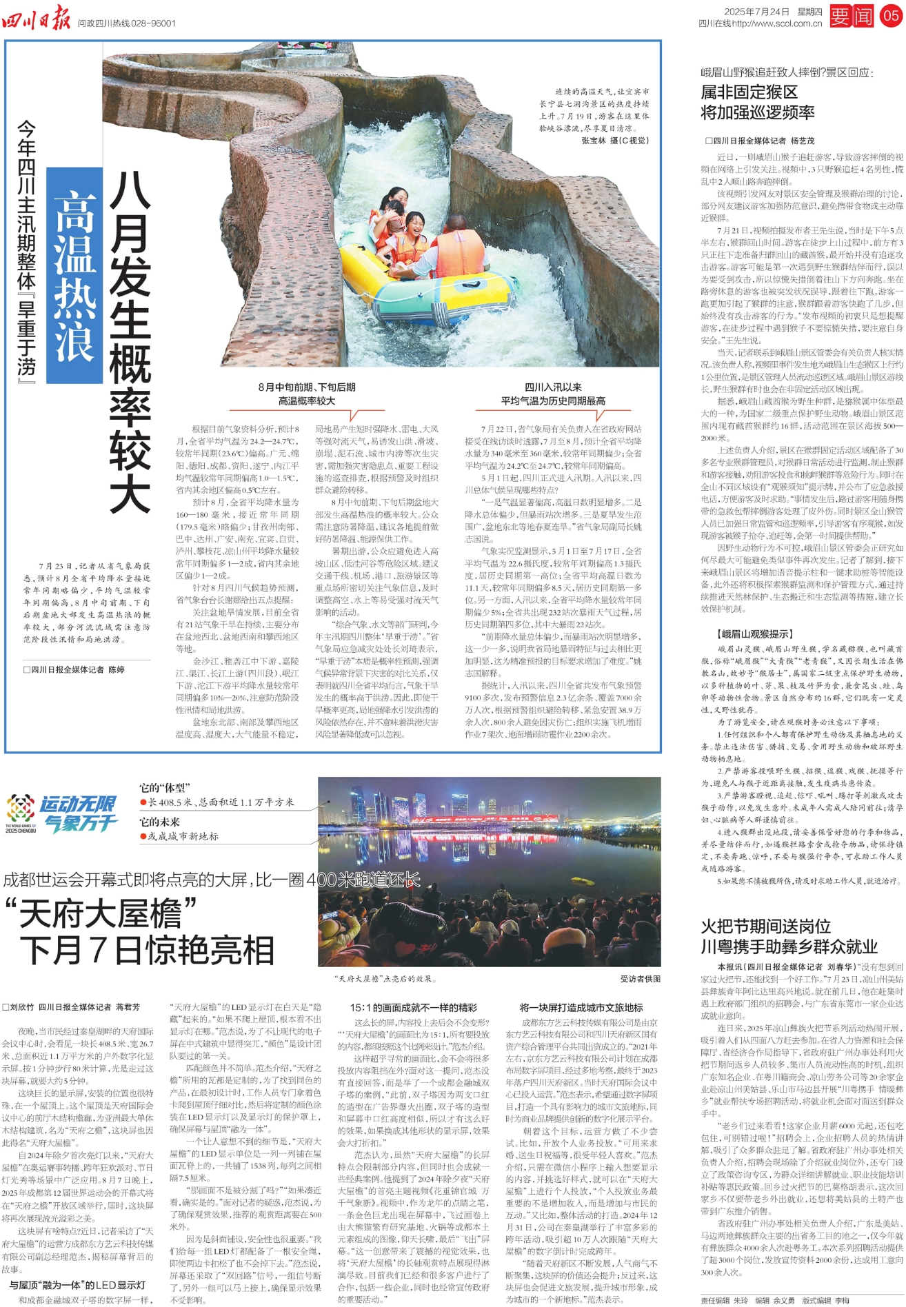 7月23日,记者从省气象局获悉,预计8月全省平均降水量接近常年同期略偏少,平均气温较常年同期偏高,8月中旬前期、下旬后期盆地大部发生高温热浪的概率较大,部分河流流域需注意防范阶段性汛情和局地洪涝。