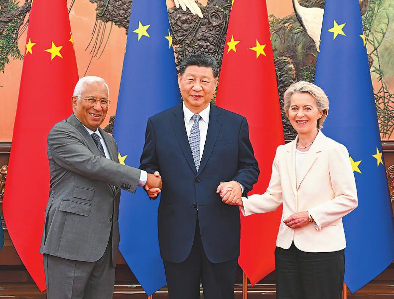 三是践行多边主义,维护国际规则秩序。面对战争与和平、竞争与合作、封闭与开放的重大选择,多边主义、团结合作才是正确答案。中欧要共同维护第二次世界大战结束后建立起来的国际规则和国际秩序,与时俱进推动构建更加公正合理的全球治理体系,携手应对气候变化等全球性挑战,让多边主义的火炬照亮人类前行之路。中欧要支持通过政治手段和平解决国际争端。中方一贯从事情本身的是非曲直出发,主张劝和促谈,倡导标本兼治。中方愿同欧方加强协调,推动今年联合国气候变化贝伦大会取得成功,为应对气候变化和全球绿色转型作出更大贡献。中方也愿同欧方开展人工智能领域政策沟通和务实合作,共同推动平等有序的世界多极化、普惠包容的经济全球化。