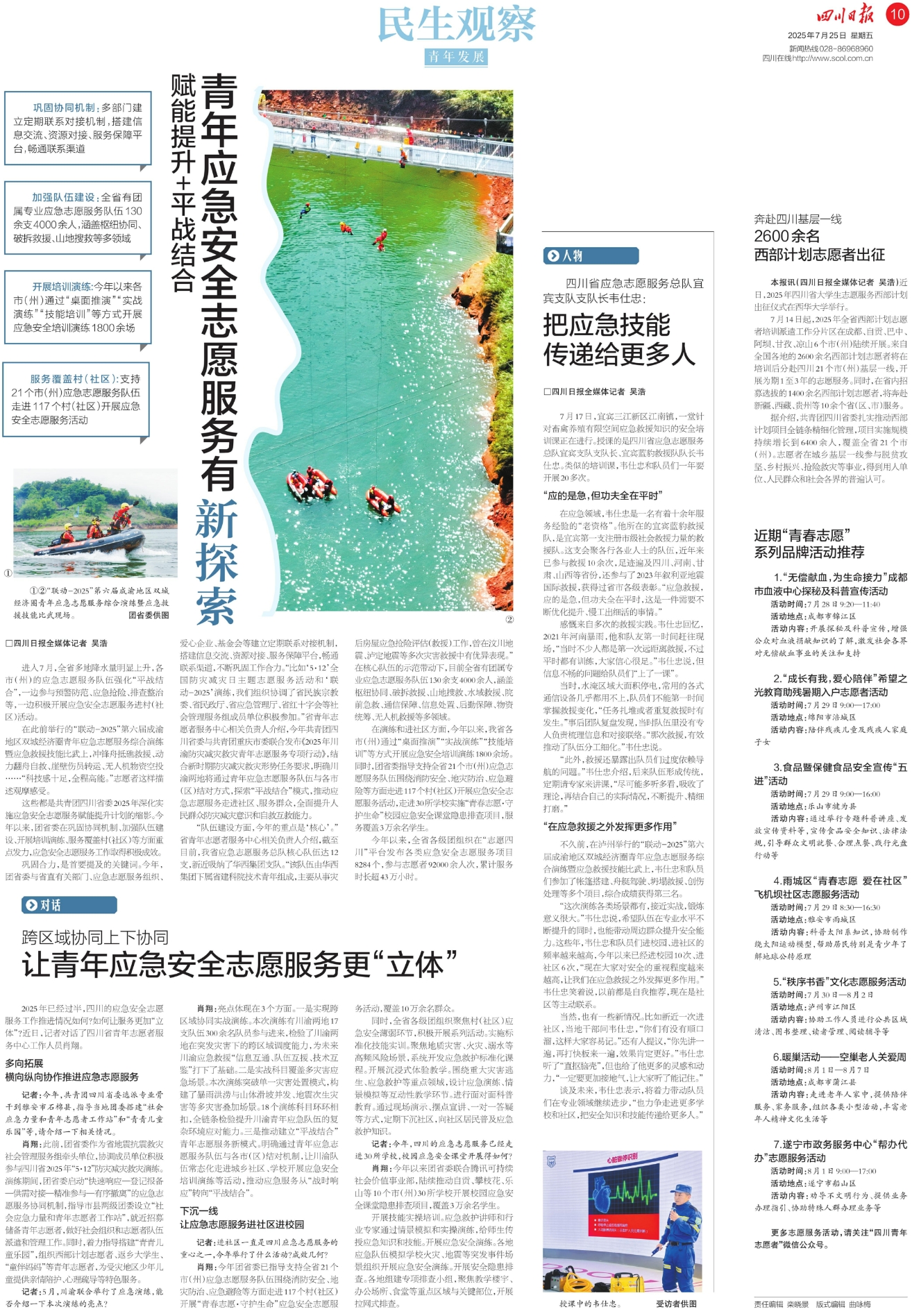 7月14日起,2025年全省西部计划志愿者培训派遣工作分片区在成都、自贡、巴中、阿坝、甘孜、凉山6个市(州)陆续开展。来自全国各地的2600余名西部计划志愿者将在培训后分赴四川21个市(州)基层一线,开展为期1至3年的志愿服务。同时,在省内招募选拔的1400余名西部计划志愿者,将奔赴新疆、西藏、贵州等10余个省(区、市)服务。