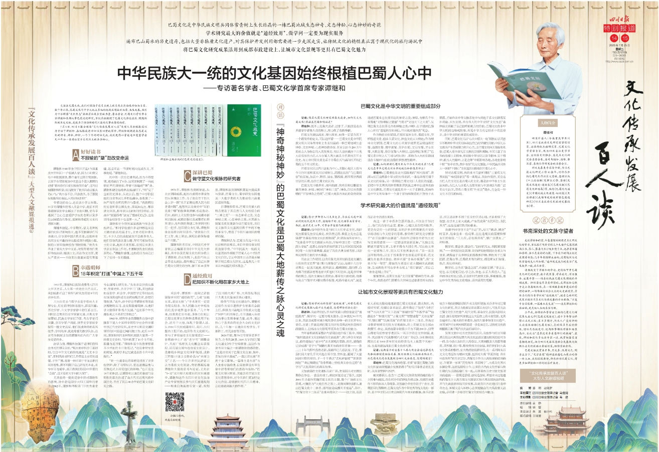 去年底,由谭继和等学者主编的巴蜀文化研究集大成之作《巴蜀文化通史》,经十多年努力终得以正式出版;差不多同时,他本人广受好评的大众通俗读物《巴蜀文脉》,在时隔多年后经修改、增补又再版发行。这两件事都让谭继和由衷高兴,自认为“总算没有辜负恩师们的教诲”。最近,谭继和还与多位老专家一道,就贯彻落实省委相关决定,助力四川文旅深度融合发展做大做强本省文化旅游业出谋划策,继续贡献余热。巴蜀文脉流贯五千年,历先秦、汉唐宋元、明清至当下,“文宗在蜀”精神浸润着巴山蜀水的每一处土地。我们深深期待,传承弘扬巴蜀文化,有更多如谭继和一样的继往开来者。