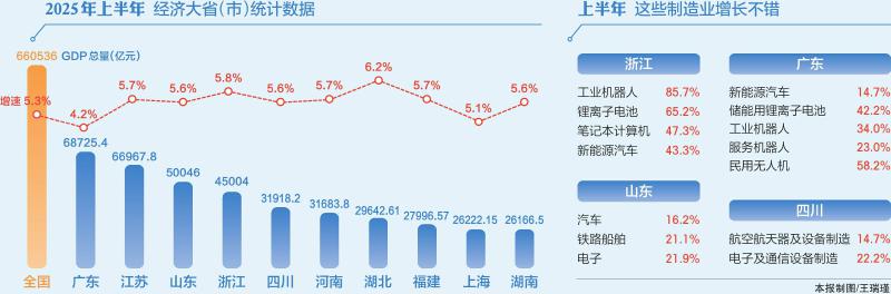 各地因地制宜发展新质生产力,科技创新和产业创新不断融合,产业含新量、含智量不断提升。年初因“杭州六小龙”出圈的浙江,上半年工业机器人、锂离子电池、笔记本计算机、新能源汽车等产品产量,分别增长85.7%、65.2%、47.3%、43.3%。广东新能源汽车、储能用锂离子电池、工业机器人、服务机器人、民用无人机产品产量分别增长14.7%、42.2%、34.0%、23.0%、58.2%。山东汽车、铁路船舶、电子等行业增加值分别增长16.2%、21.1%、21.9%。四川航空航天器及设备制造、电子及通信设备制造分别增长14.7%、22.2%。