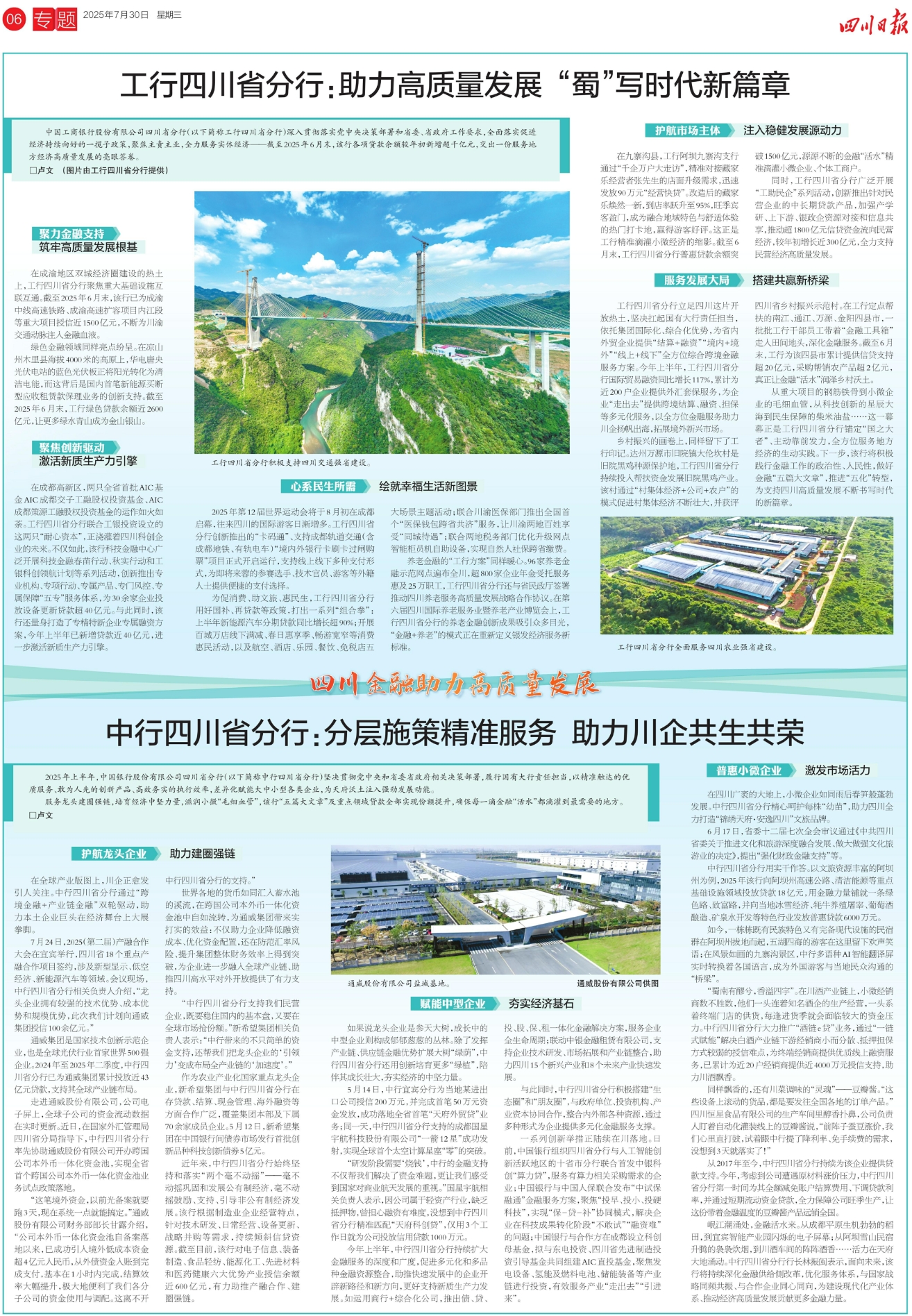 2025年上半年,中国银行股份有限公司四川省分行(以下简称中行四川省分行)坚决贯彻党中央和省委省政府相关决策部署,履行国有大行责任担当,以精准触达的优质服务、敢为人先的创新产品、高效务实的执行效率,差异化赋能大中小型各类企业,为天府沃土注入强劲发展动能。