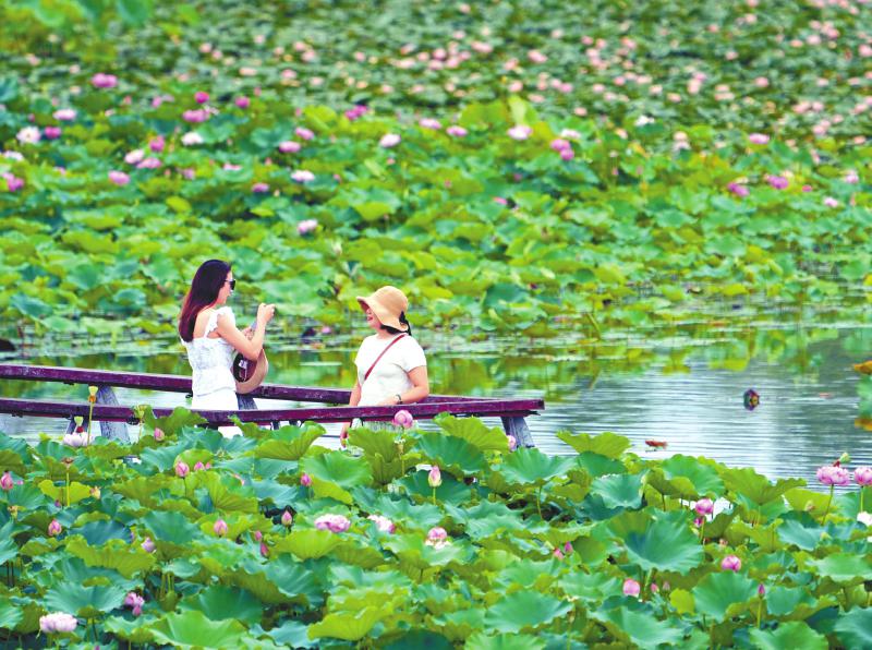 遂宁市船山区圣莲岛世界荷花博览园荷花盛开,吸引游客打卡。 钟敏 摄(C视觉)