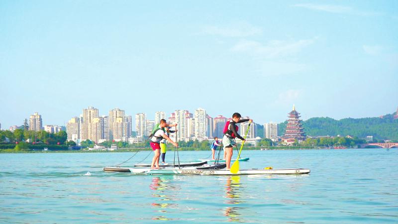 桨板爱好者在观音湖上划行。遂宁观察 刘益静 摄